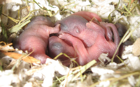 - Las crías nacen rosadas, sin pelo, ciegas y sordas